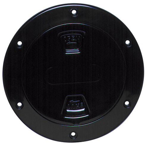 Provides access without the use of tools. Watertight, lightweight, non-corroding and durable. Single start, non-jamming, self-cleaning screw threads. Requires a cut hole of 4-1/2". Standard trim ring: 6-1/8". Inside diameter: 4". Color: Black trim with a smooth textured black center plate.