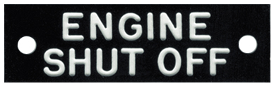 Molded plastic construction. Black background, white lettering. May be glued, mounted, or screwed in place. Label reads: "ENGINE SHUTOFF". Dimensions: 1/2" X 1-1/2".