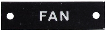Molded plastic construction. Black background, white lettering. May be glued, mounted, or screwed in place. Label reads: "FAN". Dimensions: 1/2" X 1-1/2".