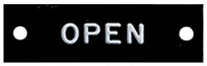 Molded plastic construction. Black background, white lettering. May be glued, mounted, or screwed in place. Label reads: "OPEN". Dimensions: 1/2" X 1-1/2".