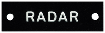 Molded plastic construction. Black background, white lettering. May be glued, mounted, or screwed in place. Label reads: "RADAR". Dimensions: 1/2" X 1-1/2".