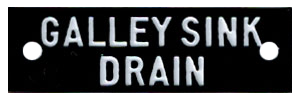 Molded plastic construction. Black background, white lettering. May be glued, mounted, or screwed in place. Label reads: "GALLEY SINK DRAIN". Dimensions: 1/2" X 1-1/2".
