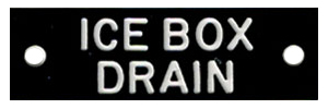 Molded plastic construction. Black background, white lettering. May be glued, mounted, or screwed in place. Label reads: "ICE BOX DRAIN". Dimensions: 1/2" X 1-1/2".