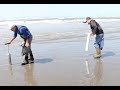 Set your clam gun barrel off-center with more sand on the side facing the water. Push down while twisting back and forth, rocking in a circular manner. Once the barrel is as deep as you can go, block the air vent on the underside of the handle with your finger, then pull straight up. When you remove your finger from the vent hole, a core of sand will drop out onto the beach -- and this is where your razor clam will be, if you've got the clammer's luck.