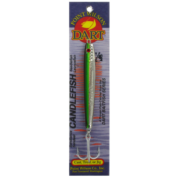 From the "Dart Baitfish" lure series. Mimics a needlefish. For jigging, trolling, or casting. Has an attached treble hook. Color: Green / nickel. Size: 2-1/4 oz.