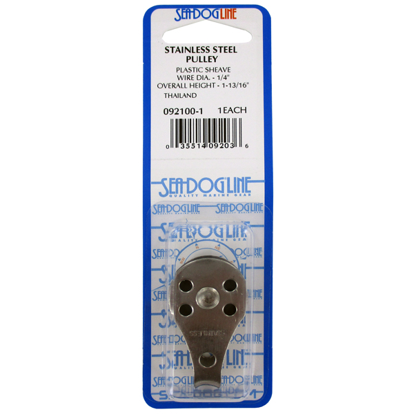 Stainless steel with plastic sheave. Sheave fits 1/4" wire rope. Overall dimensions: 1-13/16" X 1/2". Display packaged.