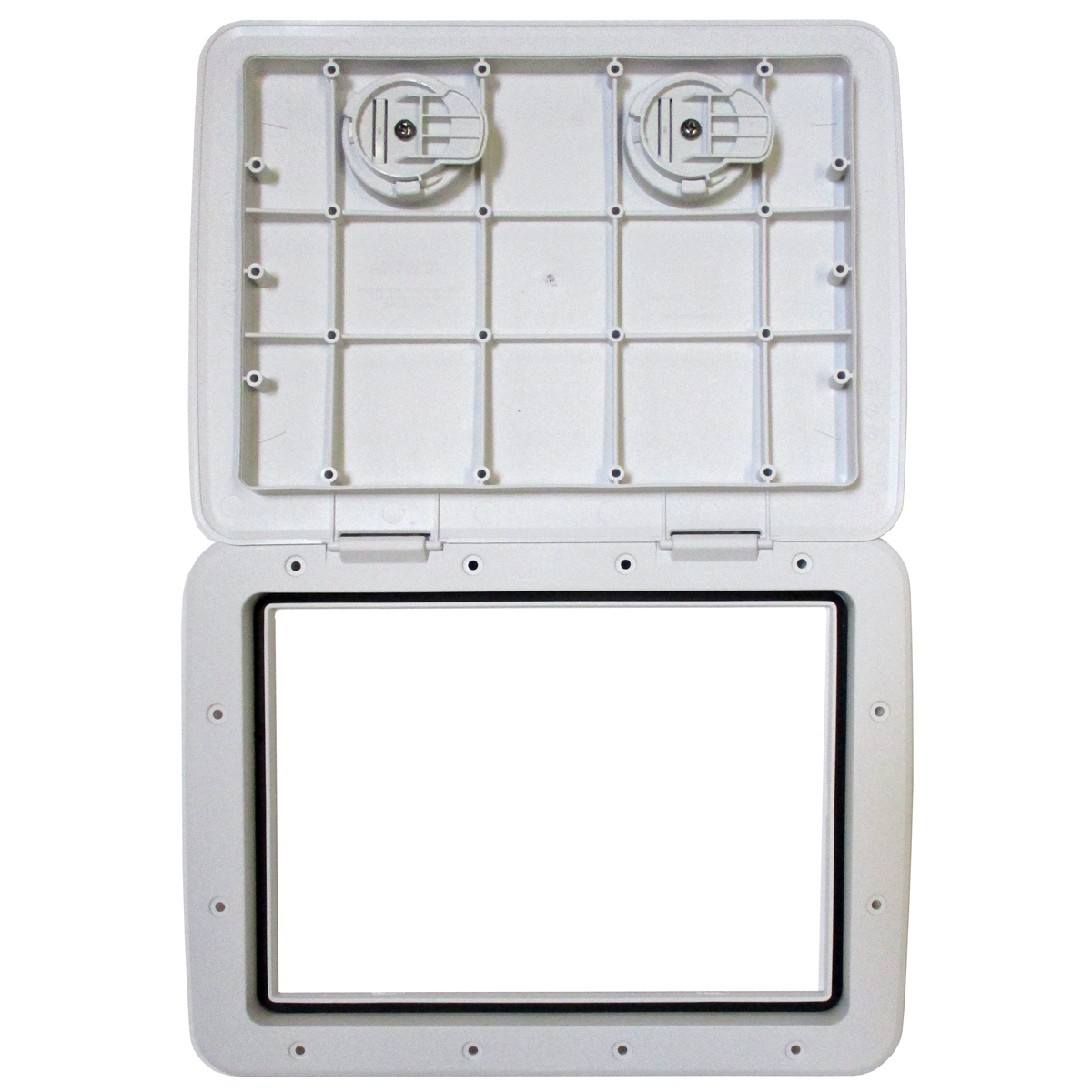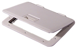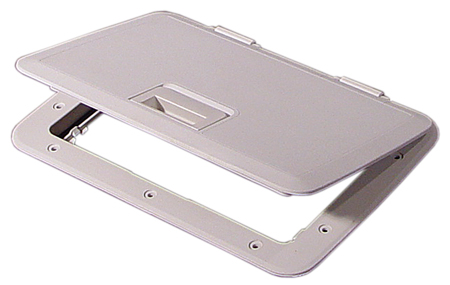 Tempress cam hatch without lock. Designed for easy access in heavy traffic areas. Built from glass-filled polypropylene for strength. Features two dog down latches. Closes easily and forms a weather tight seal. Great for dry storage areas or bait or fish wells. Color: White. Dimensions: 13" X 30-3/8" OD; 10-5/8" X 27-1/2" ID. Weight: 5 lbs.