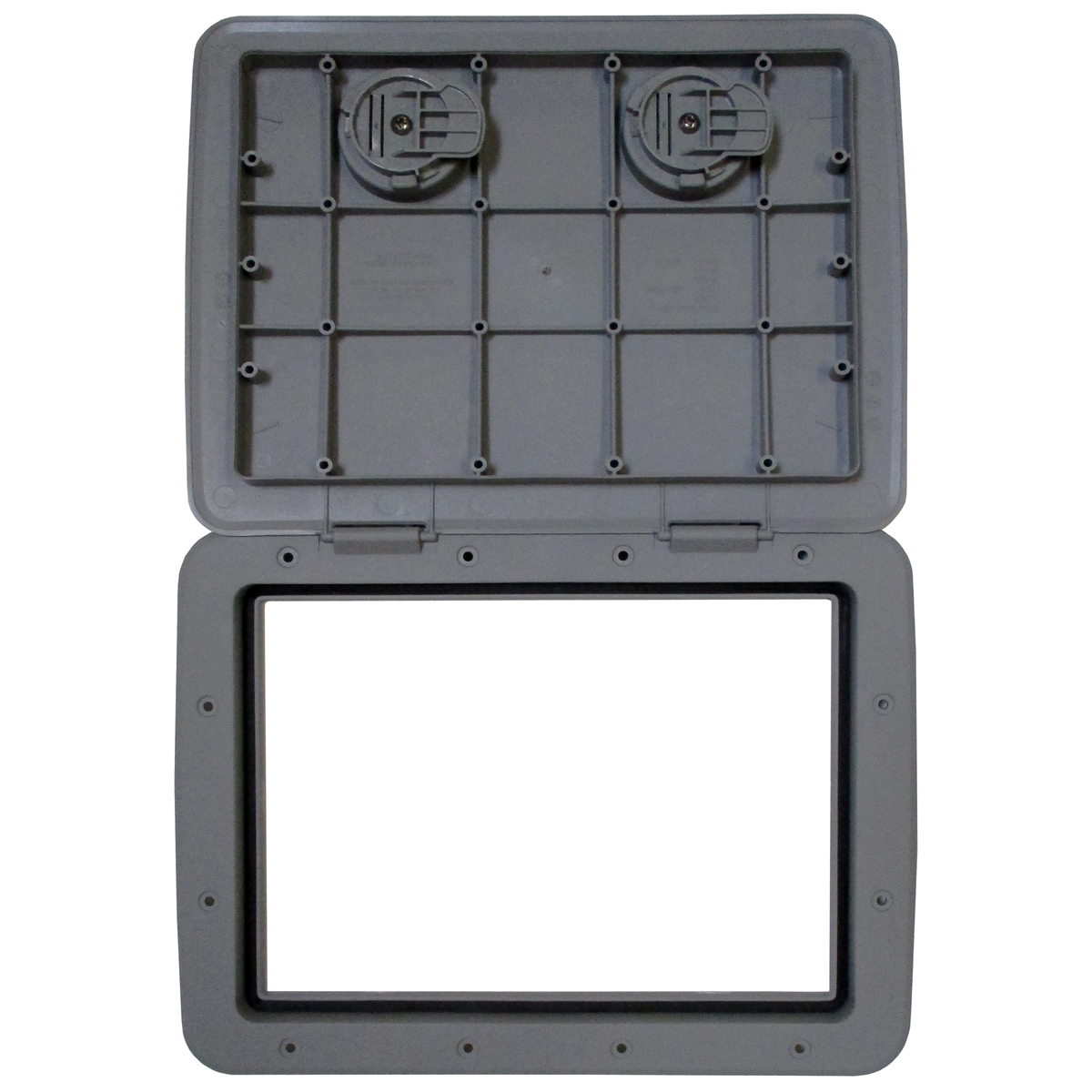 Tempress cam hatch without lock. Designed for easy access in heavy traffic areas. Built from glass-filled polypropylene for strength. Features two dog down latches. Closes easily and forms a weather tight seal. Great for dry storage areas or bait or fish wells. Color: Dark Gray. Dimensions: 13" X 30-3/8" OD; 10-5/8" X 27-1/2" ID. Weight: 5 lbs.