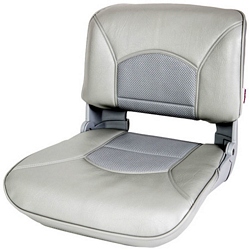 Tempress NaviStyle high-backed boat seat. Designed for ergonomic functionality. Provides lumbar support but flexible for lateral movement. Features "no-pinch" hinges and a high back for comfort. Color: Gray / Gray. Dimensions: 21-3/4" X 18" X 19-1/2".