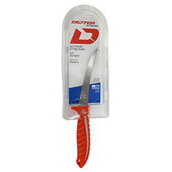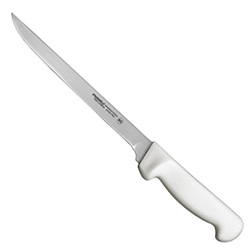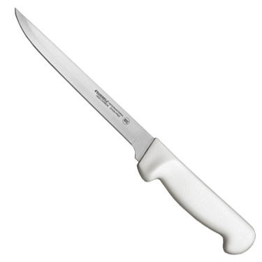 Flexible, curved, stain-free, high-carbon steel 6" blade. Durable, slip-resistant white polypropylene handle. NSF certified.