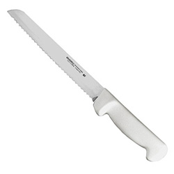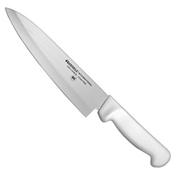 Stain-free, high-carbon steel 10" blade. Durable, slip-resistant white polypropylene handle. NSF certified.