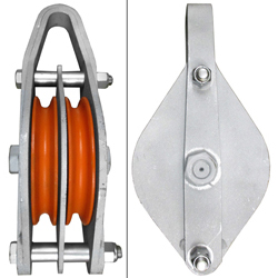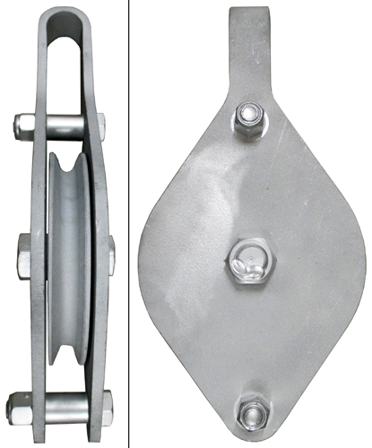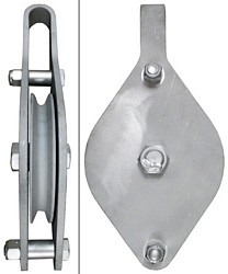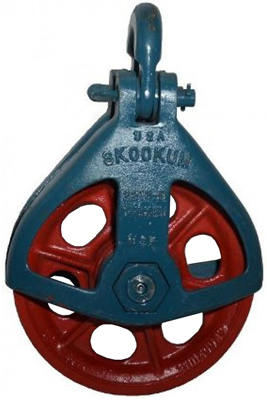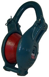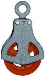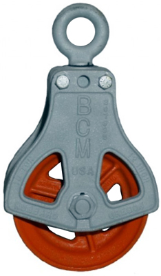 Rigging block with a wide throat. Allows eyes and rigging to pass through. Very heavy-duty design with Timken roller bearings. Sheave made of Manganese for durability and long lifespan. Safety factor of 5:1. Commonly referred to as a "Tommy Moore" block. Dimensions: 6" X 3".