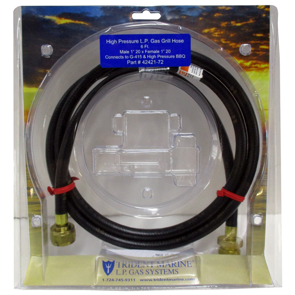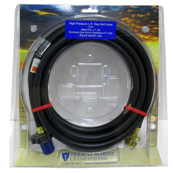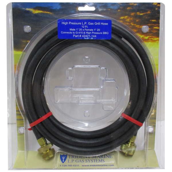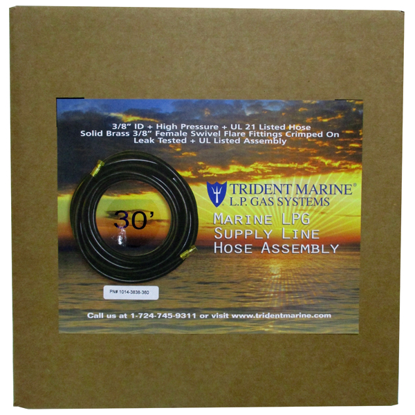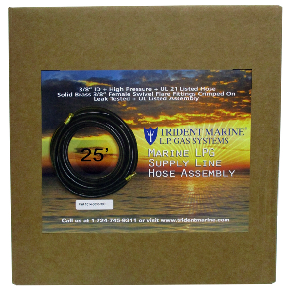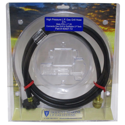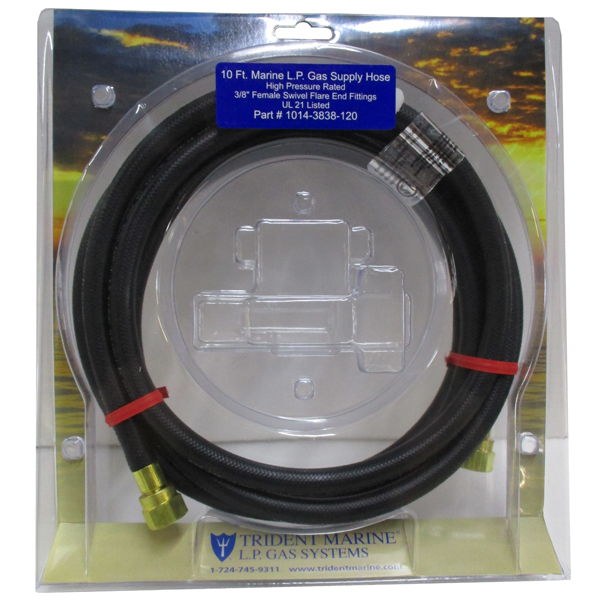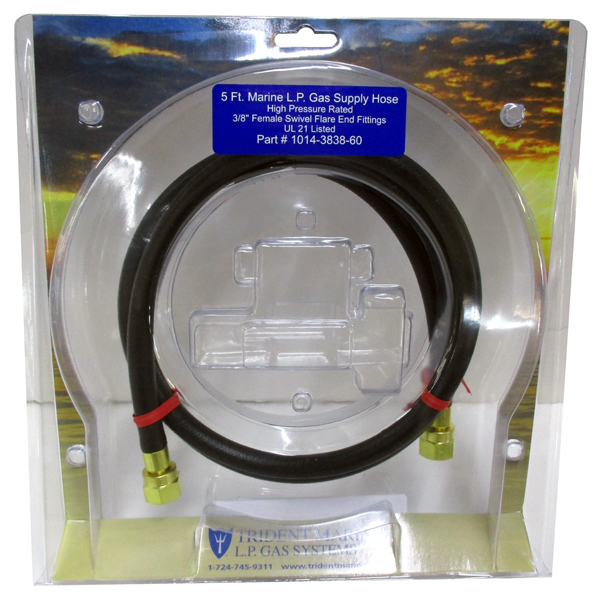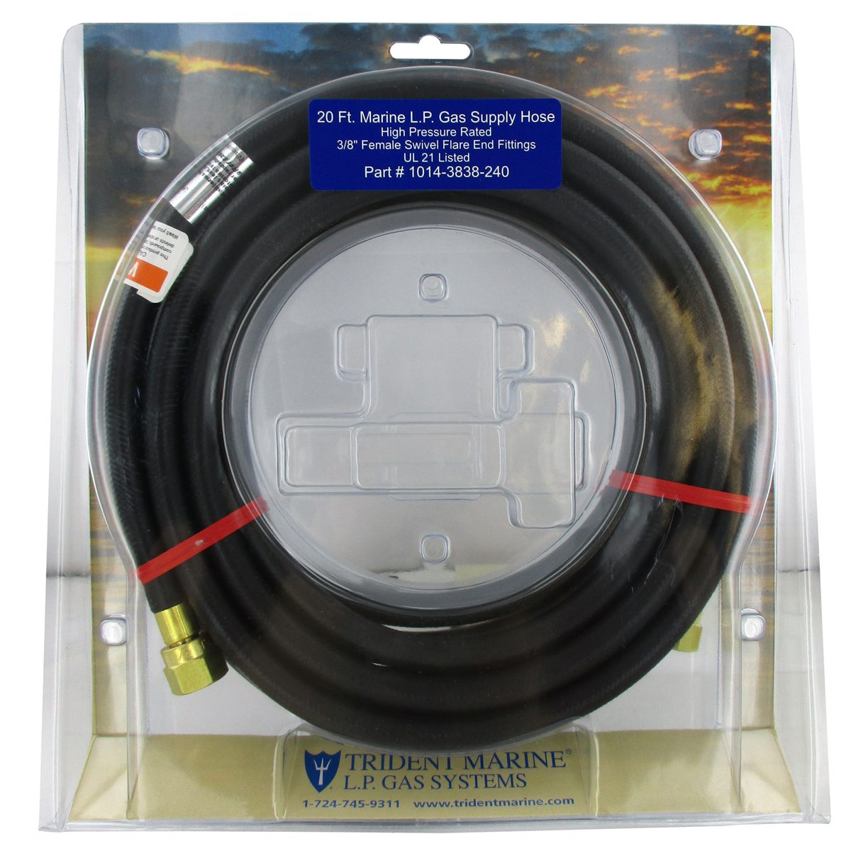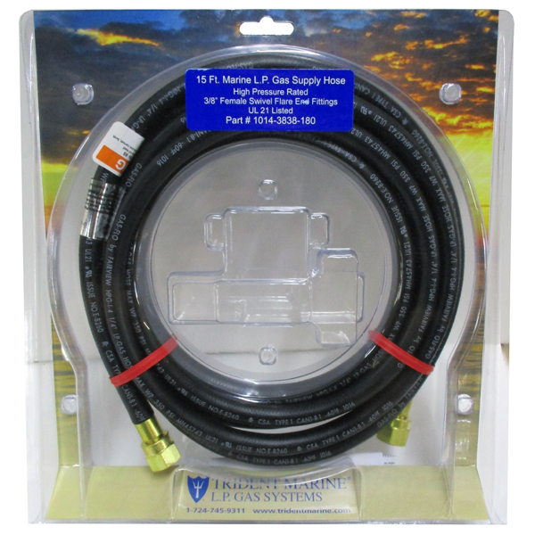 Propane / liquid petroleum gas (LPG) supply hose. Thermoplastic construction. Both ends are 3/8" female flare fittings. Length: 15 feet.
