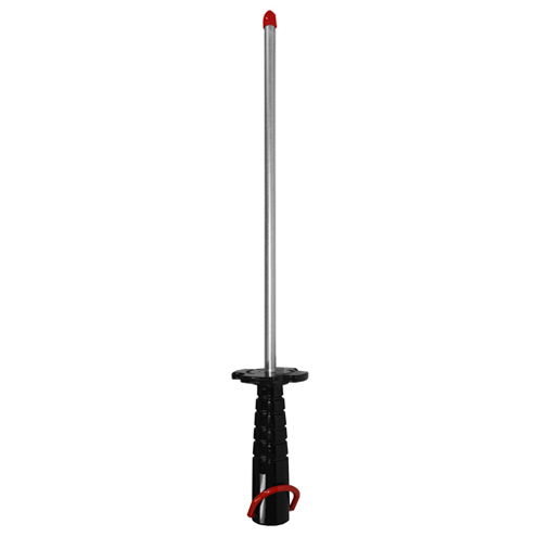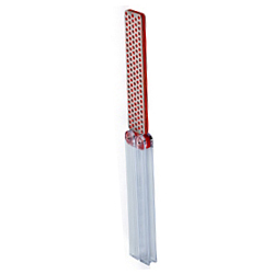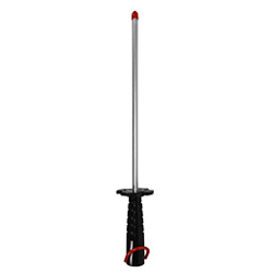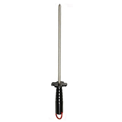Chef-style steel with the fast-honing capability of diamonds Sanitary black plastic handle with a large guard. Red hanging ring for quick identification as "fine grit". Fine diamond grit (25 micron / 600 mesh). Produces a razor sharp edge. Dimensions: 12" X 3/8".